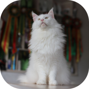 Une élégance pure et immaculée. Le blanc intégral donne au Maine Coon une allure de statue de marbre, majestueuse et sereine.